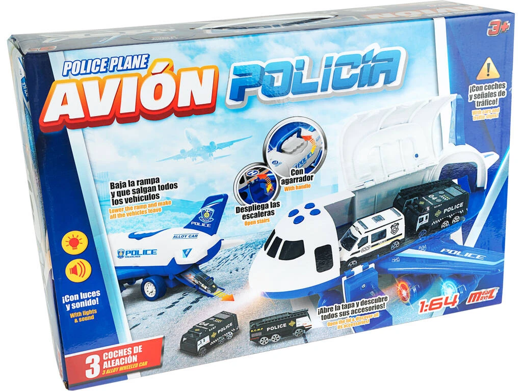Incluye: 1 avión maleta porta coches de la policía con luces y sonidos, 3 coches de la policía y 7 señales de tráfico.