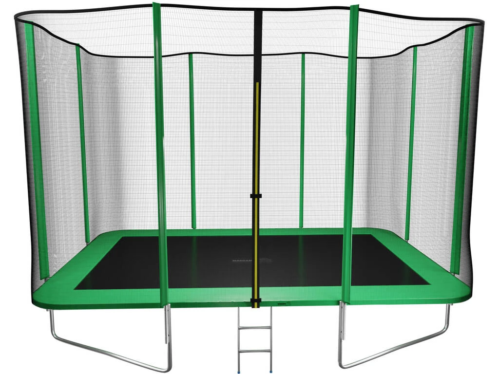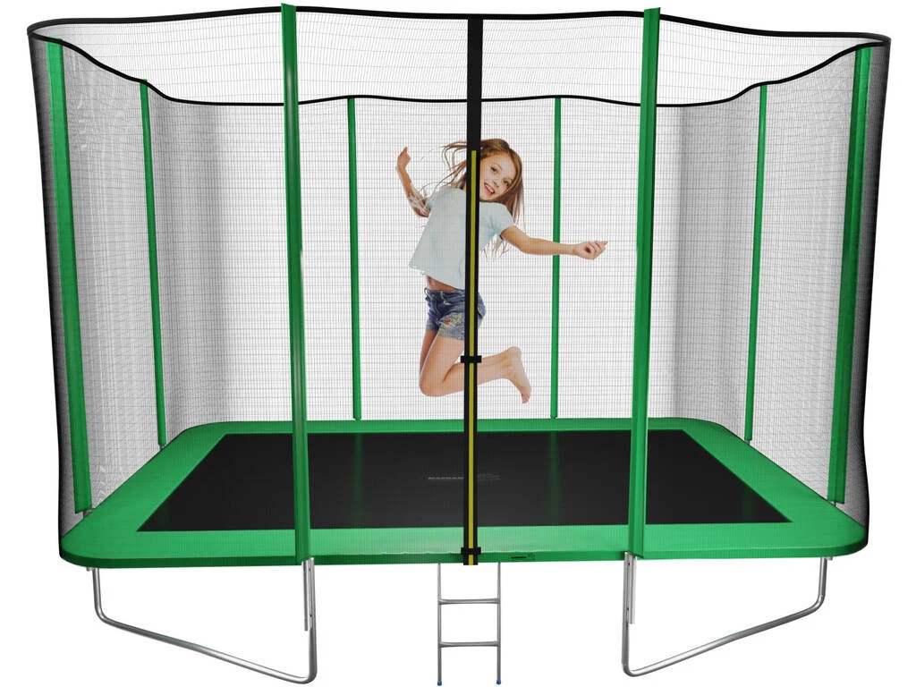 Incluye: 1 cama elástica Deluxe Rectangular L con red de seguridad con cremallera en la entrada, escalera y juego de anclajes.