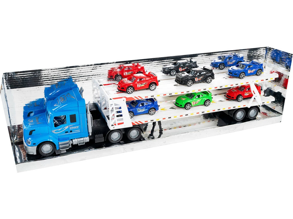 Incluye: 1 camión portacoches de color azul con sistema de fricción y 6 coches de competición.