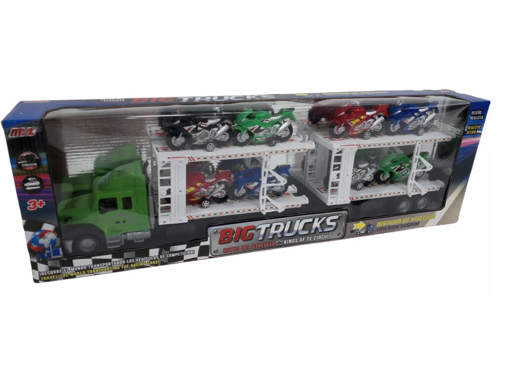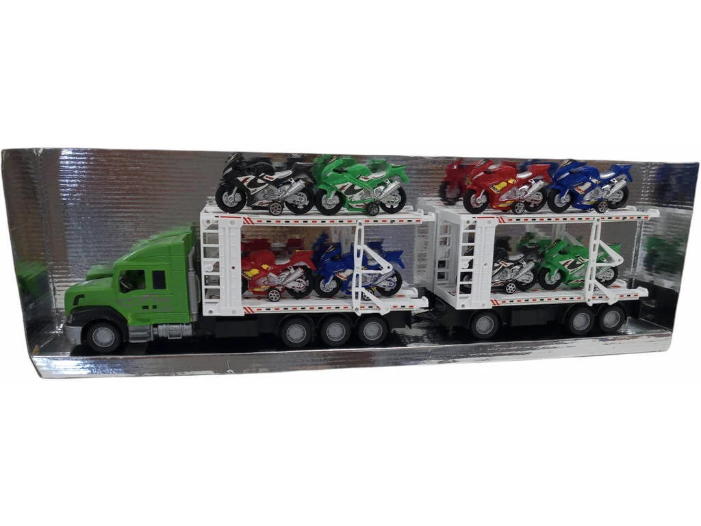 Incluye: 1 camión portamotos de color verde con remolque doble y 8 motos de competición.
