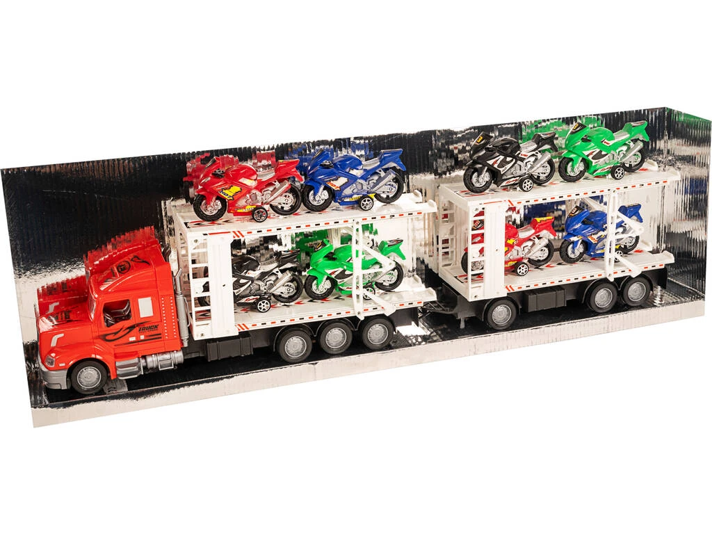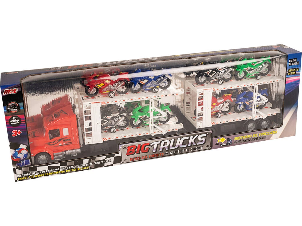 Incluye: 1 camión portamotos de color rojo con remolque doble y 8 motos de competición.
