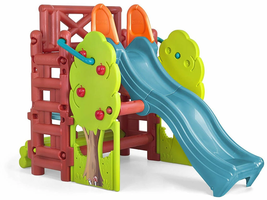 La zona de juegos más completa del mercado, cuenta con tobogán con forma de ola, plataforma elevada para que los niños puedan subir al tobogán o bien, jugar por la parte baja de la misma. Dispone de dos escaleras para acceder a la parte superior y una decoración muy original, además puedes convertir el banco abatible que incluye en un fantástico arenero o bien para que los niños puedan jugar en la mesa.