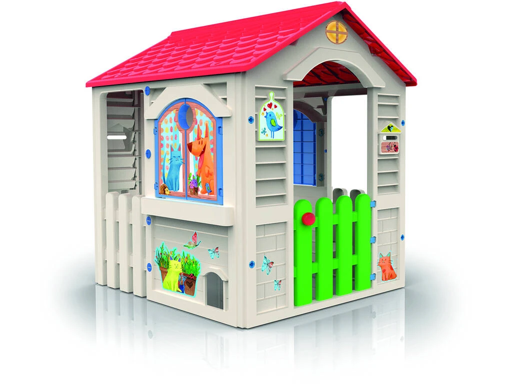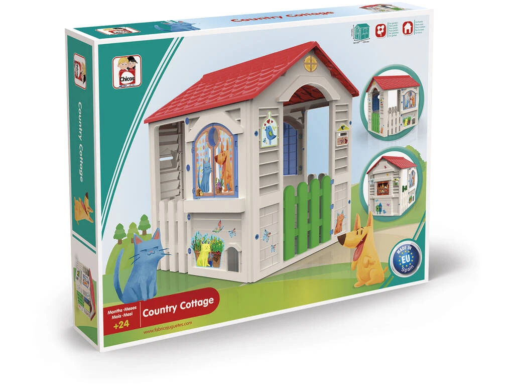 Estupenda casita de campo infantil, ideal para colocar en el jardín o en el interior de casa. La casa cuenta con un diseño muy especial. Sus paredes laterales cuentan con una pequeña valla de jardín y a continuación una «pared» con ventanas que podrás abrir y cerrar, e incluso una pequeña gatera en la parte inferior. La puerta principal es una «valla» de jardín a media altura, lo que nos permite ver con facilidad el interior de la casa, también dispone de un buzón para cartas y decoración de pajaritos, mariposas, perros y gatos.