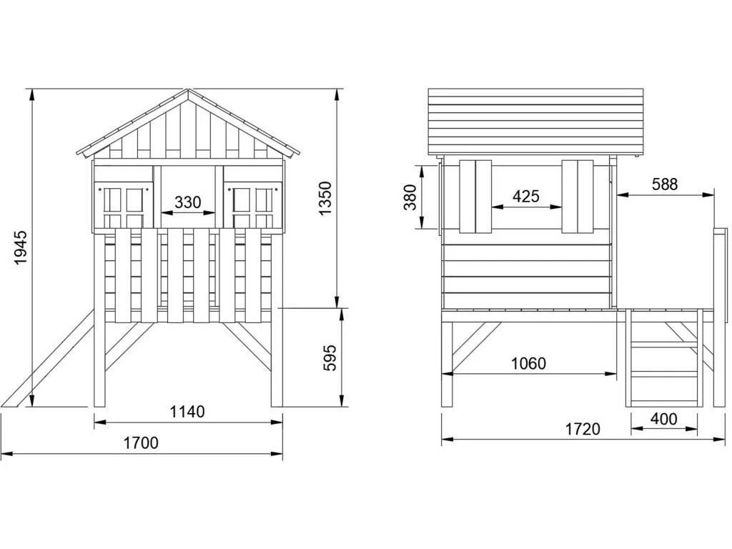 Medidas aproximadas de la casita con la plataforma: 195 cm de alto, 172 cm de ancho y 266 cm de largo (teniendo en cuenta el tobogán).