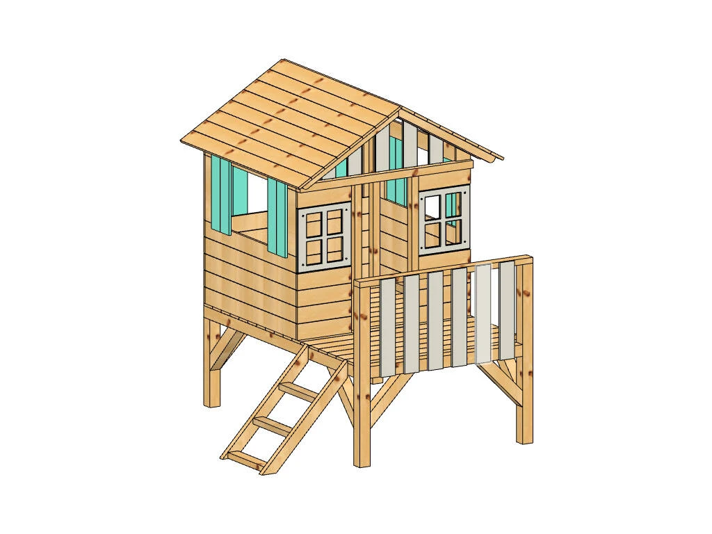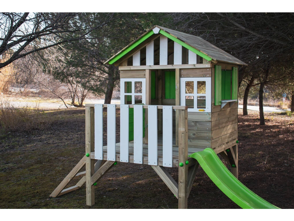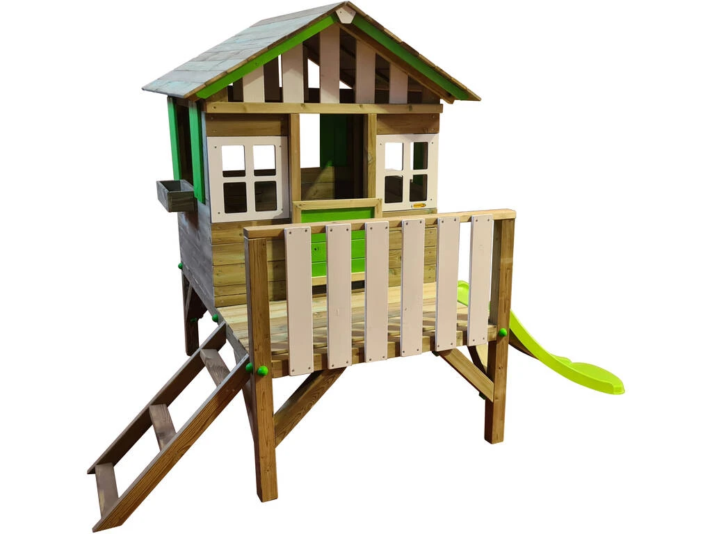 Incluye: 1 casita infantil elevada Lollipop de color verde con plataforma elevada, rampa de tobogán, escaleras de madera, puerta de entrada y ventanas.