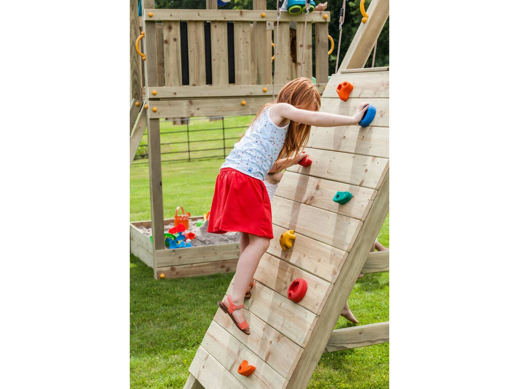 Incluye: Pack de Challenger XL para parque infantil con estructura con columpio integrado, dos asientos de plástico con cuerdas, piedras de escalada, anclajes y herrajes.