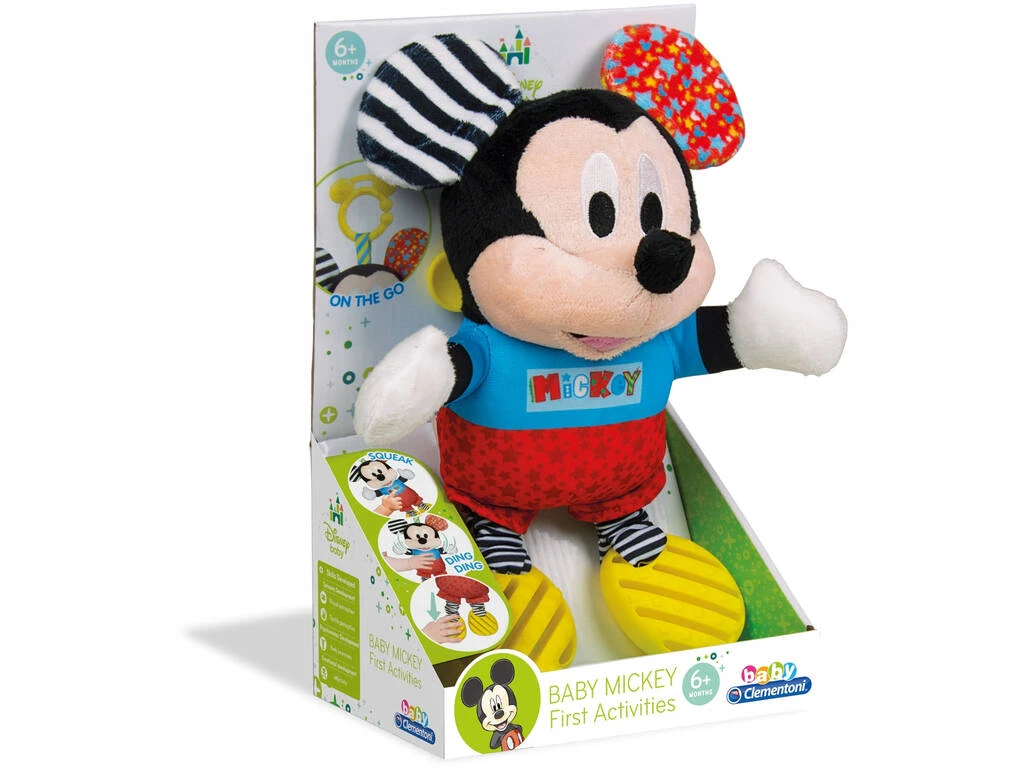 Los zapatos de Mickey son unos prácticos mordedores acompañados de unas graciosas piernas elásticas, sus orejas tienen un sonido muy particular cuando se aprietan y también dispone de un cascabel que suena al agitar el muñeco o un chirrido si se presiona su barriguita.