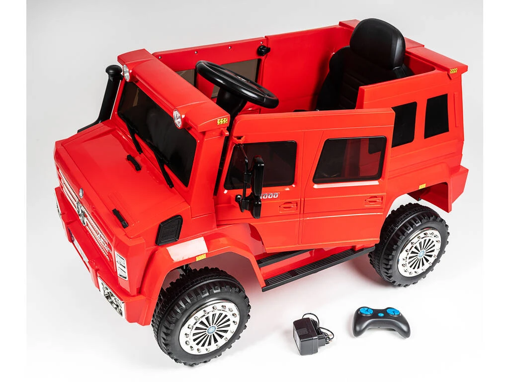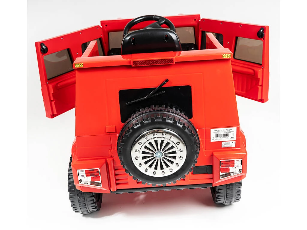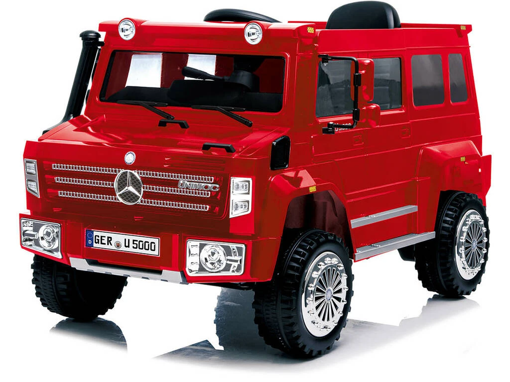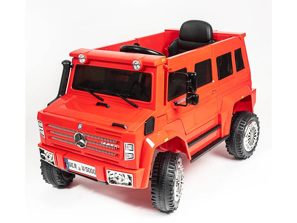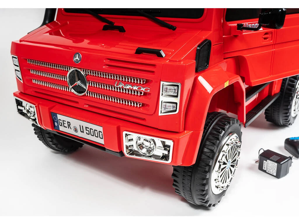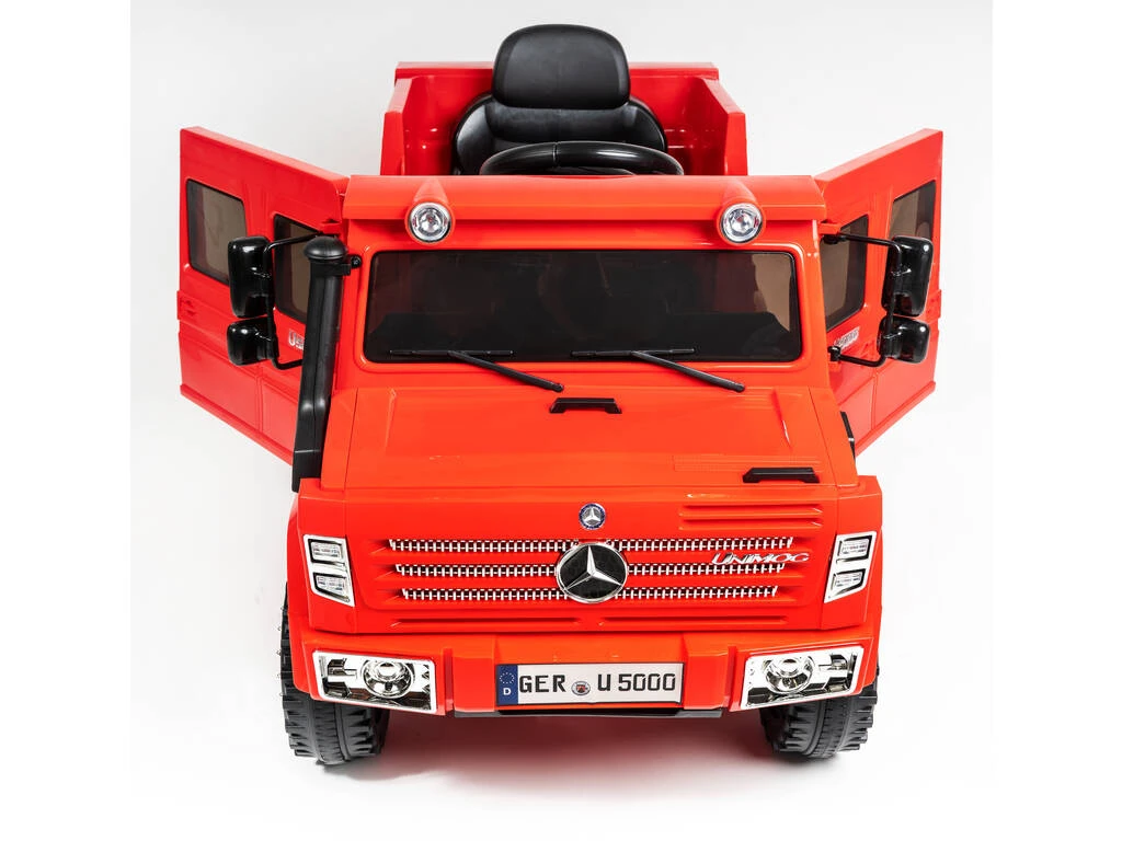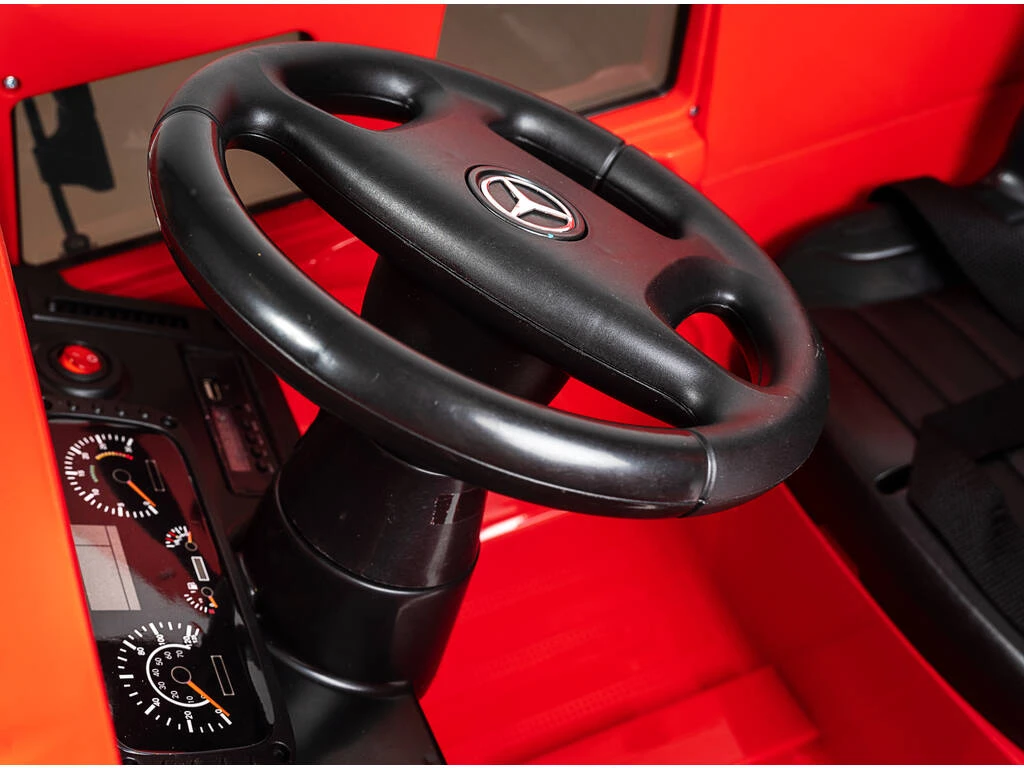 Incluye: 1 camión infantil Mercedes Benz Unimog U5000 de color rojo con 2 baterías de 6v 5,4 Ah, conexión bluetooth, luces, música, control remoto con tecnología de frecuencia 2,4 GHz y cargador para la batería.