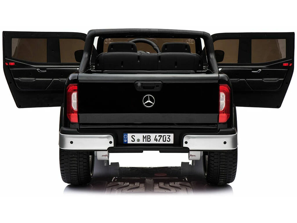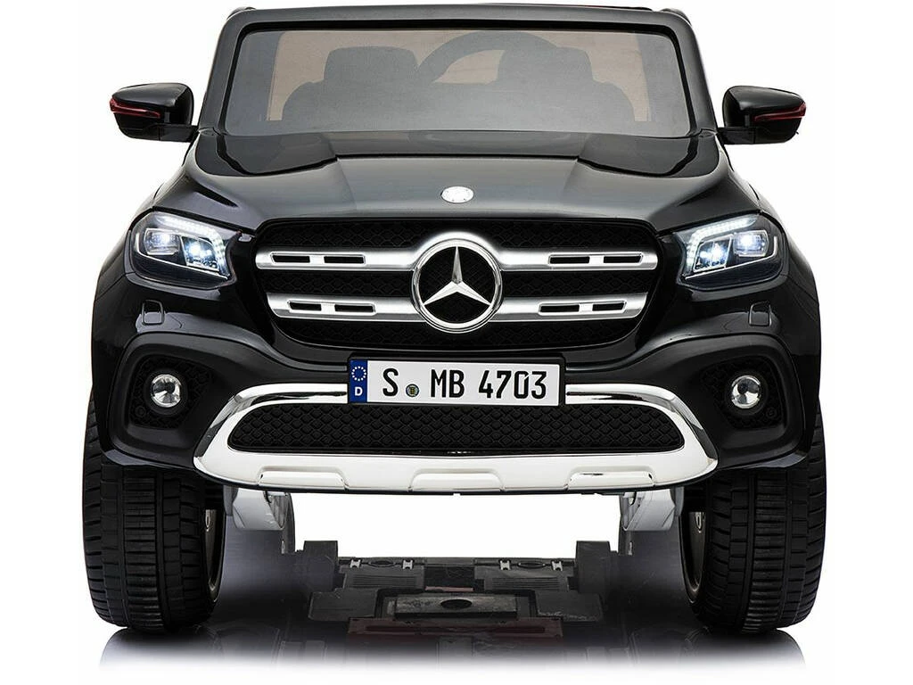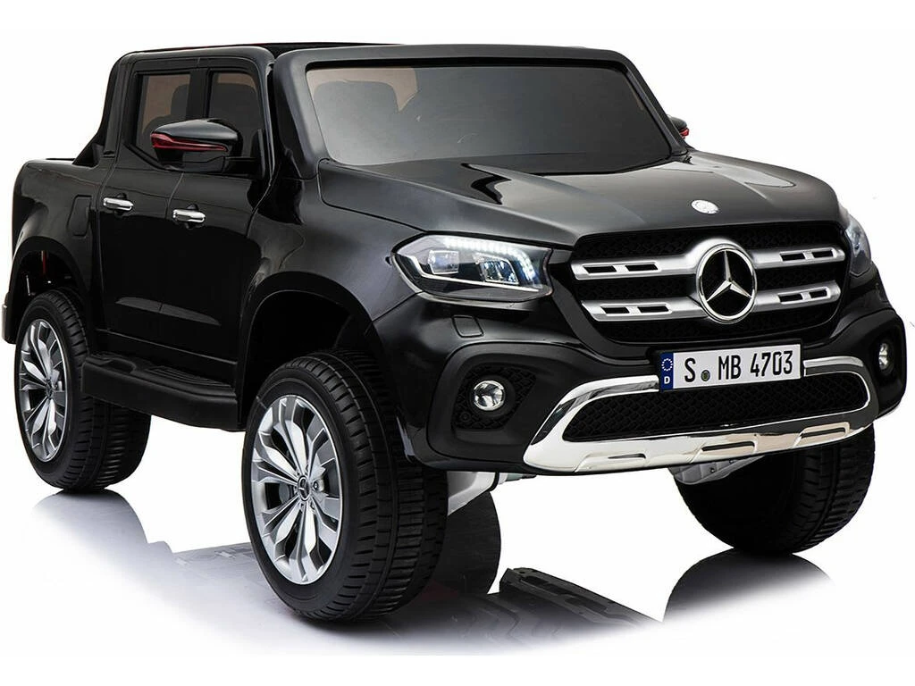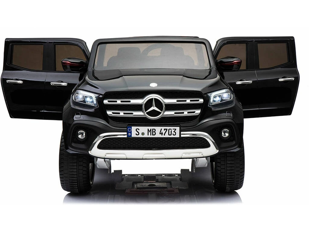 – Incluye: 1 vehículo infantil de batería Mercedes Benz X-Class de color negro con luz, música y conexión MP3 y USB, 1 mando control remoto con tecnología 2,4 Ghz, 1 batería 12V 7AH y cargador para la batería.