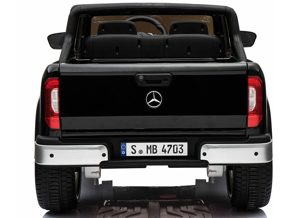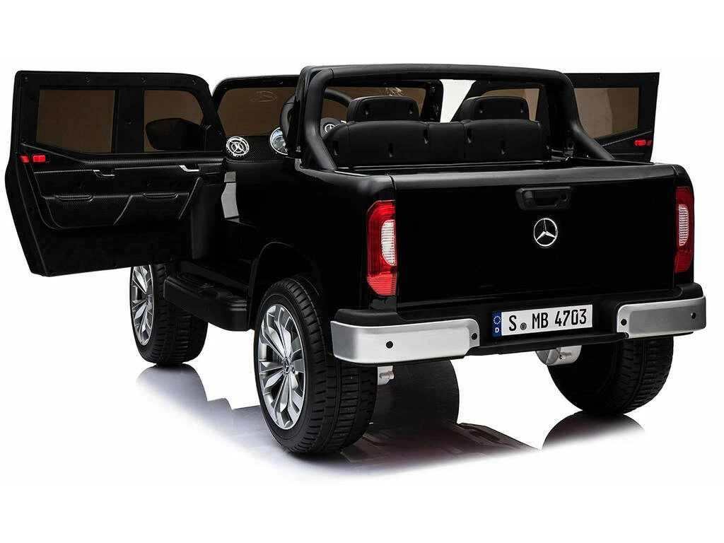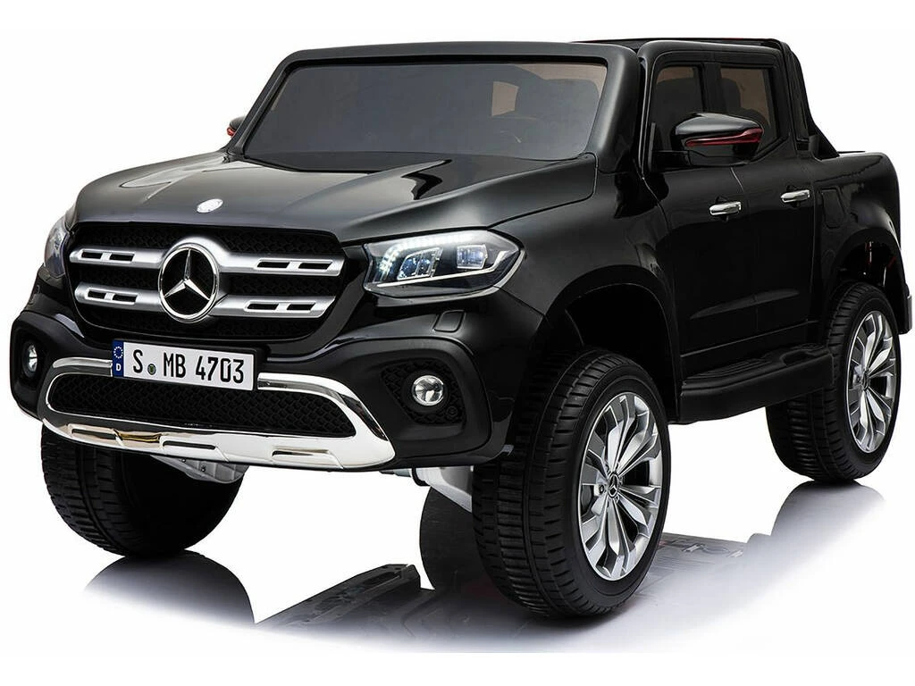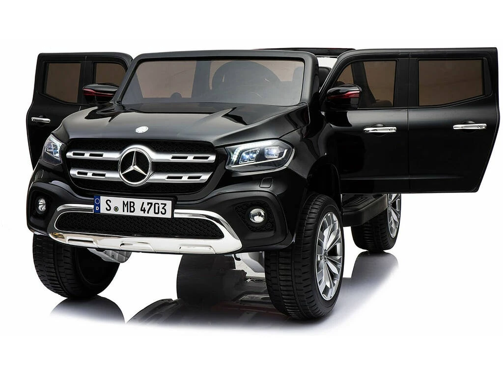 – Incluye: 1 vehículo infantil de batería Mercedes Benz X-Class de color negro con luz, música y conexión MP3 y USB, 1 mando control remoto con tecnología 2,4 Ghz, 1 batería 12V 7AH y cargador para la batería.