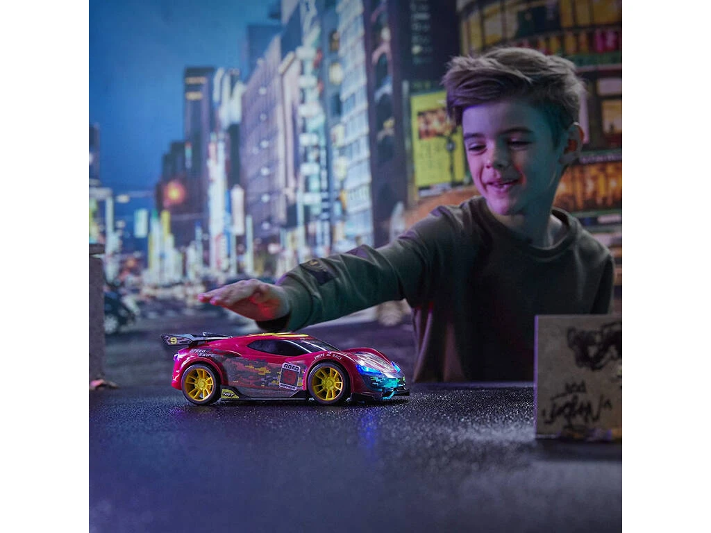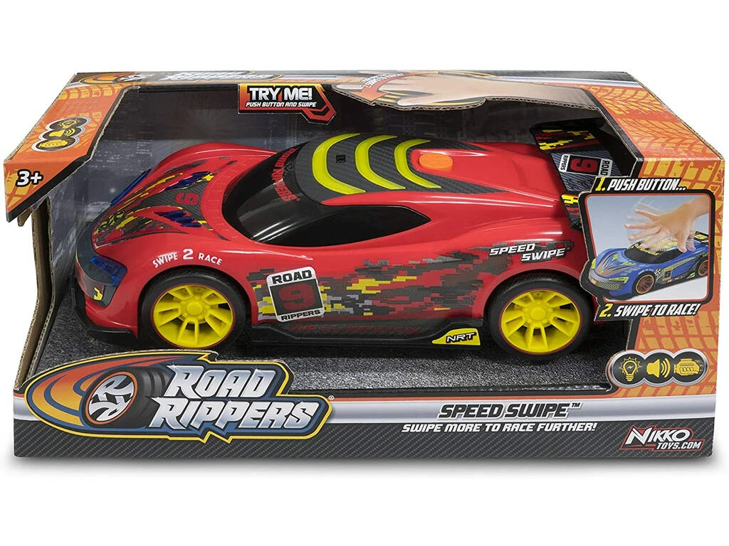 Incluye: 1 vehículo Speed Swipe de color rojo con luces, sonidos de motor y función especial de movimiento automático.