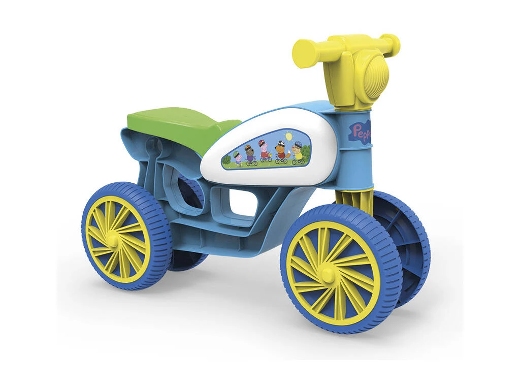 Sorprende a los pequeños fans de las aventuras de Peppa Pig con este genial correpasillos fabricado en plástico ligero y resistente. Un correpasillos azul, blanco, amarillo y verde, listo para un sin fin de aventuras. El vehículo infantil incluye cuatro ruedas de plástico para mayor estabilidad, manillar cómodo para dirigir la conducción y un sillín que les da mayor firmeza a la hora de dirigir el vehículo a todas partes. ¡Podrán recorrer toda la casa de forma súper divertida y segura!
