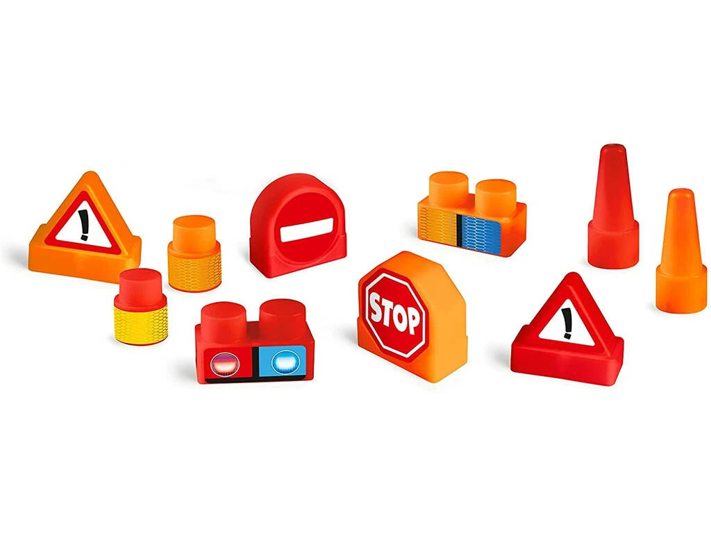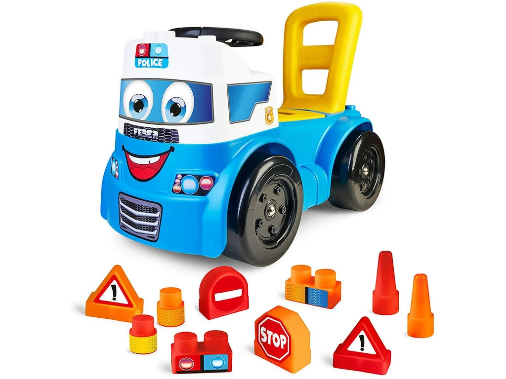 Incluye: 1 correpasillos infantil de empuje Motorfeber Blocks Policía de color azul y blanco y 10 bloques de construcción de diferente forma y estilo.