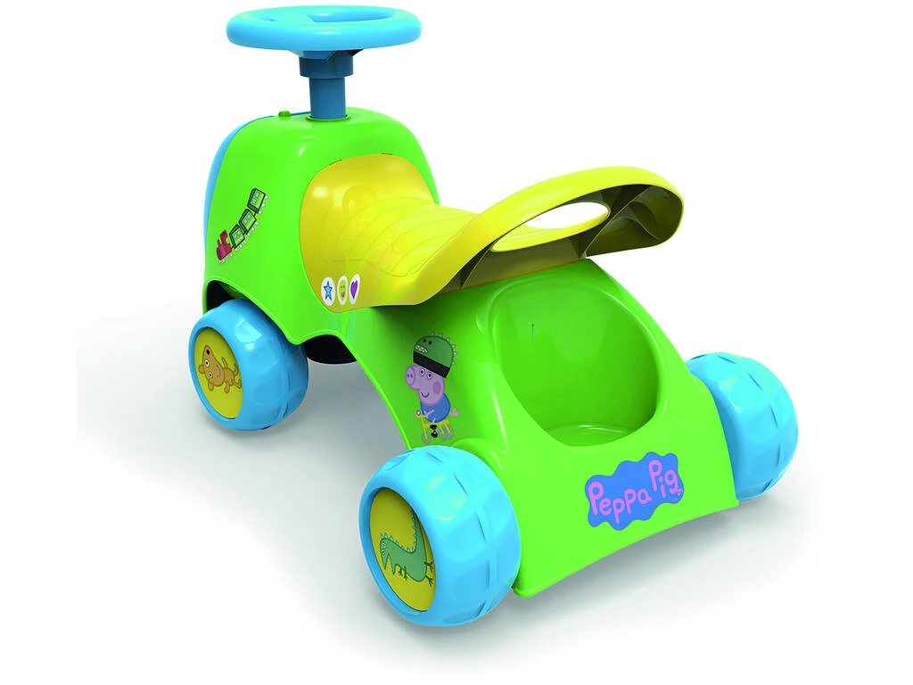 Hazte con este genial correpasillos infantil, fabricado en plástico ligero y de gran resistencia, un vehículo lleno de pegatinas de Peppa Pig, sobre el que vivir nuevas aventuras tanto fuera, como dentro de casa. El correpasillos incluye ruedas de plástico, volante, asa en el asiento para el transporte y maletero abierto en la parte trasera.