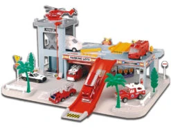 La estación de bomberos tiene helipuerto, parking, ascensor para que los coches suban a la primera planta, una rampa para que la salida de los vehículos sea más rápida y un pequeño garaje con 2 aparcamientos. La estación dispone de luces y sonidos reales. Tiene 4 botones: aviso puerta, aviso entrenamiento, aviso emergencia y luces y sonidos.