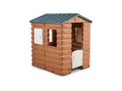 Incluye: 1 casa infantil Camping Cottage de color marrón estilo madera, con puerta, ventanas y diferentes espacios de juego.
