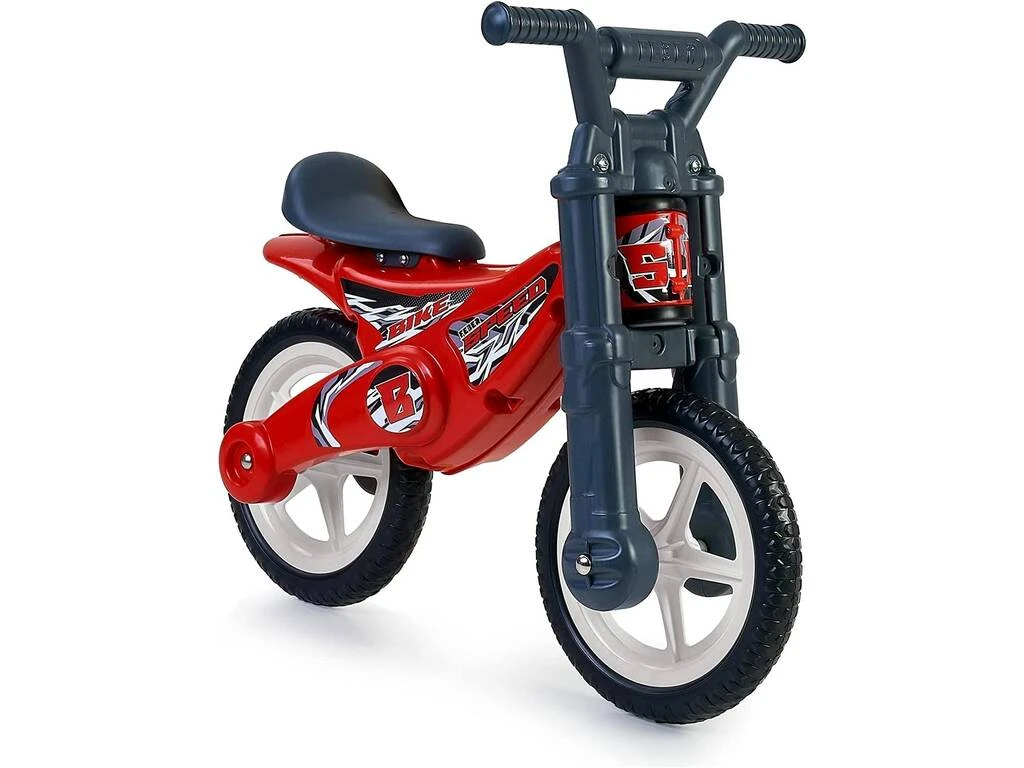 Incluye: 1 moto correpasillos Feber Speed Bike de color roja y gris con cubiertas de foam, estructura de plástico ligero y resistente, pegatinas de competición y peso ligero.