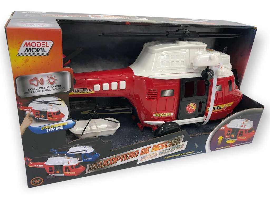 Incluye: 1 helicóptero de rescate de color rojo y blanco con botones que activan movimientos de hélices, luces y sonidos de acción, una camilla de rescate para el helicóptero, ruedas, gancho de rescate, espacio interior y más sorpresas.