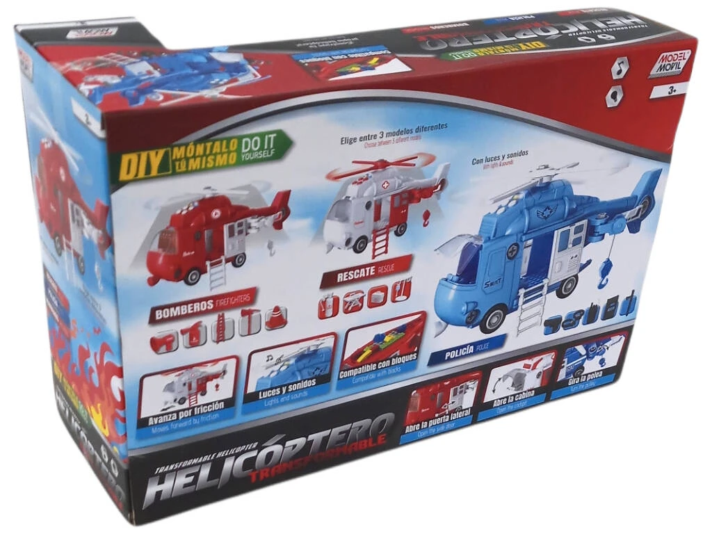 Incluye: 1 helicóptero transformable de la policía color azul y blanco, con luces y sonidos, 1 esposas, 1 escalera para el helicóptero, 1 walkie, 1 pistola, 1 escudo y 1 destornillador con 3 cabezales diferentes.
