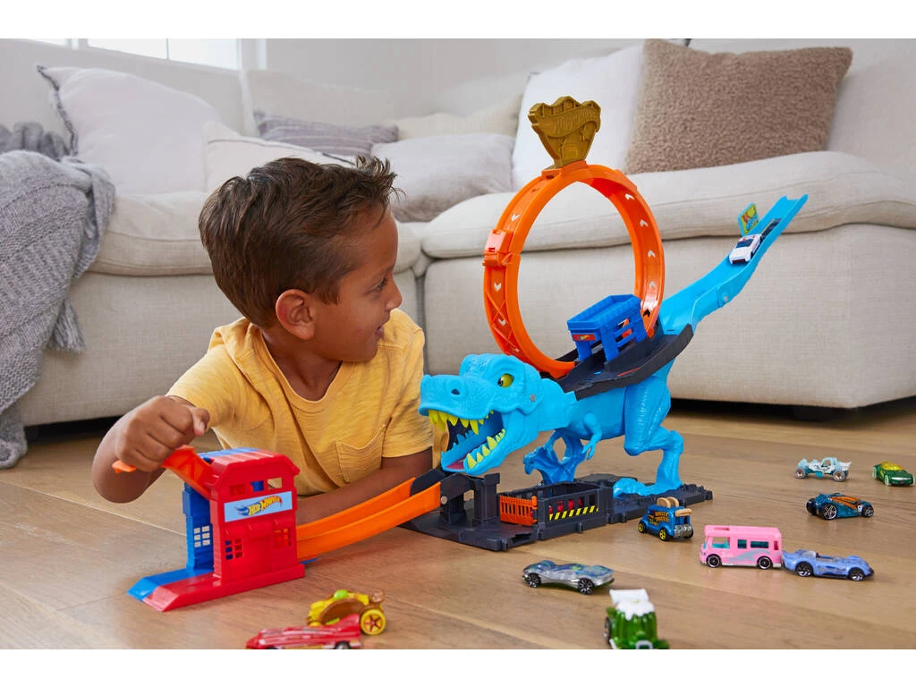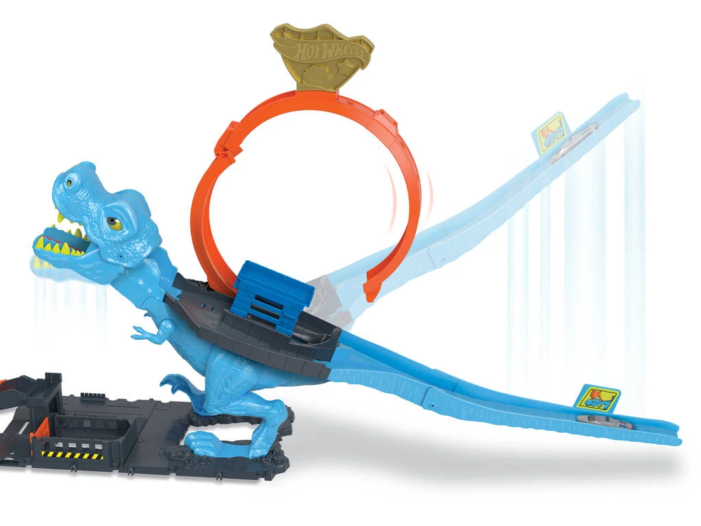 ¡Prepárate para afrontar un reto lleno de acción y diversión! ¡Hazte con el nuevo y completo Hot Wheels City Desafío del T-Rex de Mattel!