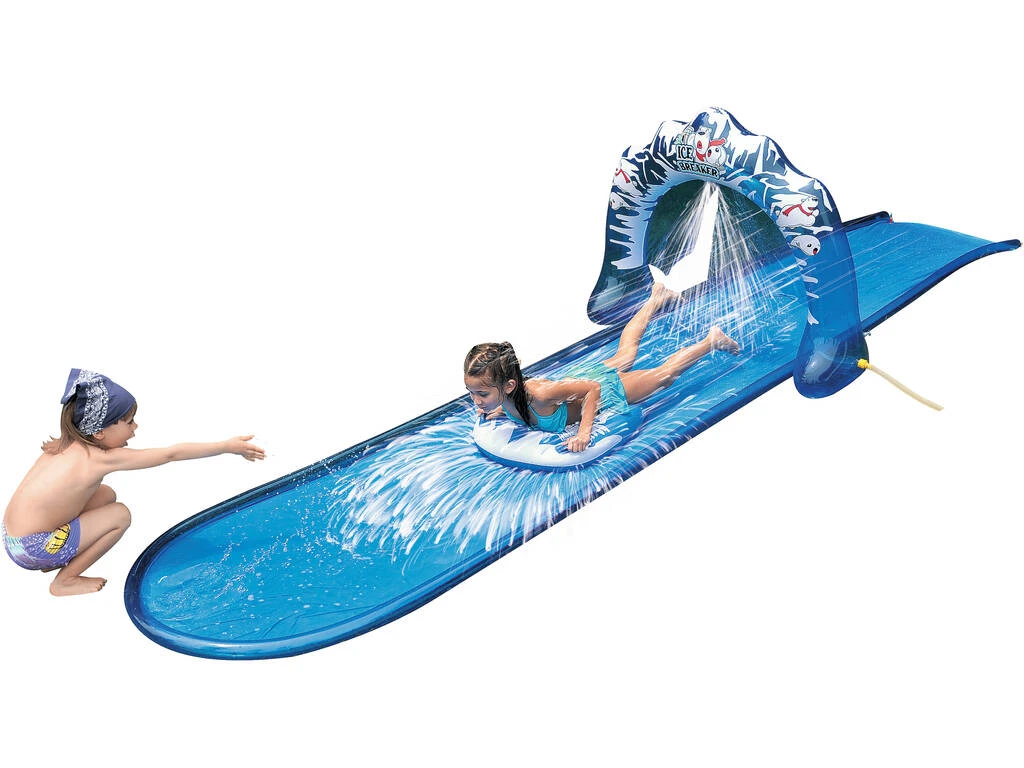 Incluye: 1 deslizador acuático Ice Braker con tabla hinchable para deslizar y arco con conexión para manguera de jardín (no incluida) y parche de reparación.