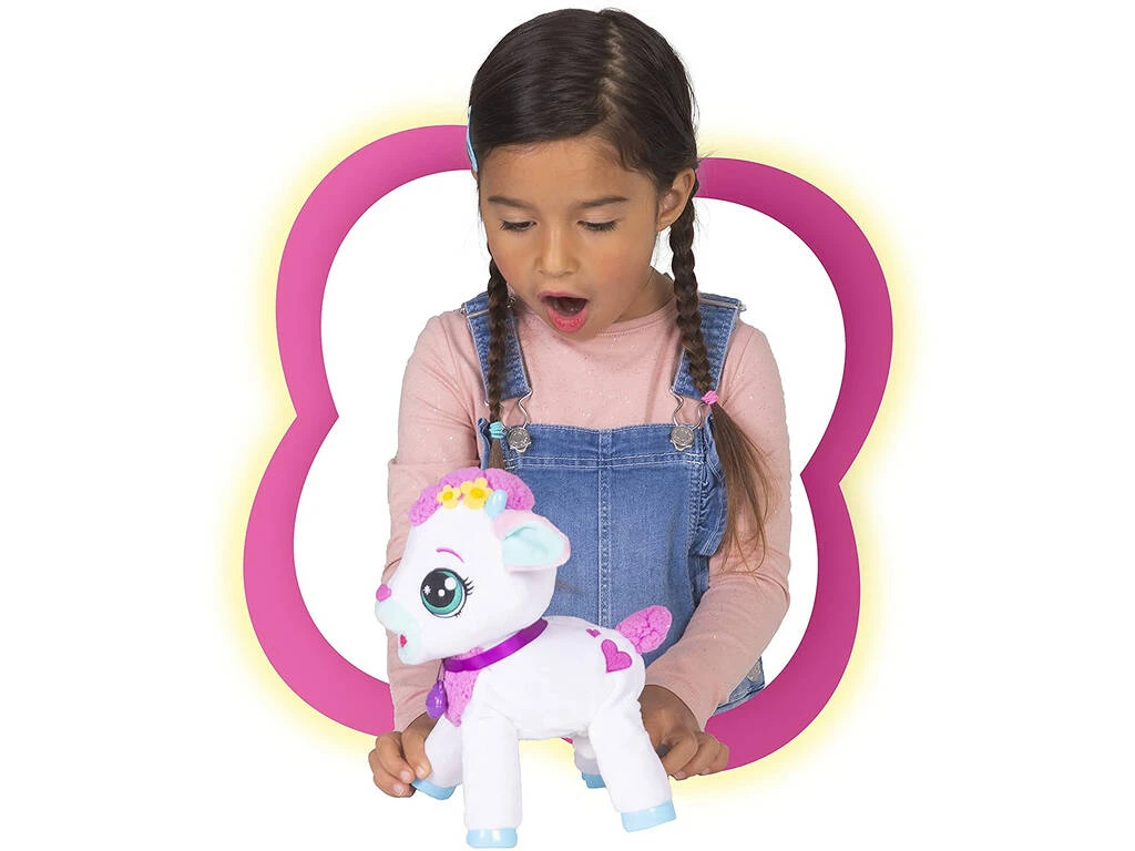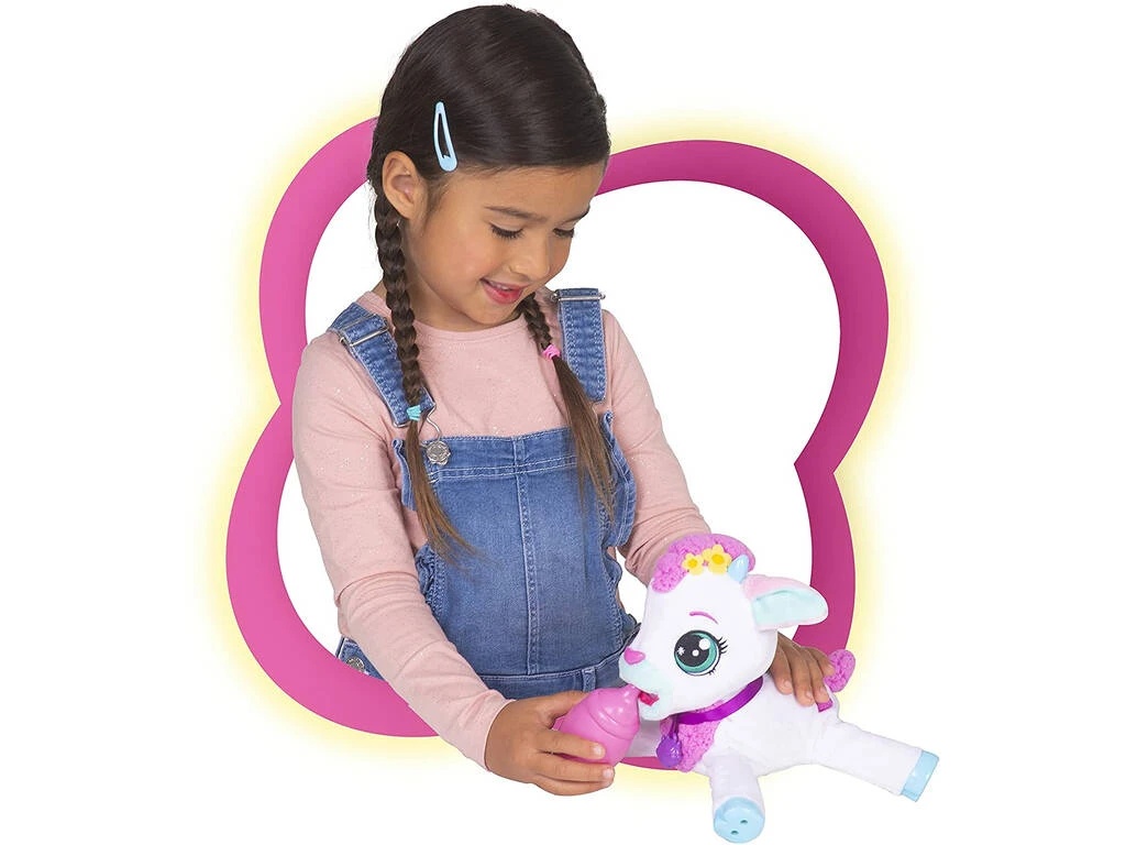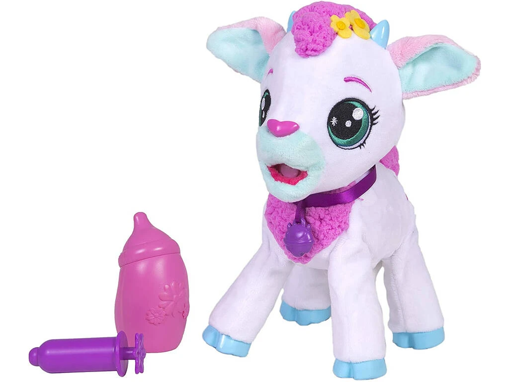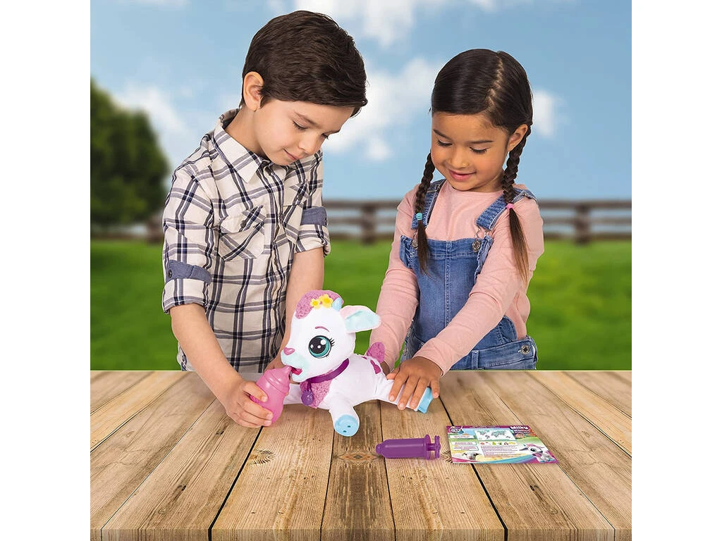 Incluye: 1 mascota interactiva Milky The Baby Goat de color blanca y rosa con collar y capaz de emitir más de 20 sonidos, 1 biberón para el juguete y 1 jeringuilla para el juguete.