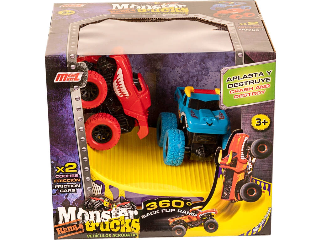 Incluye: 1 rampa amarilla para vehículos, 1 vehículo Monster Truck rojo y 1 vehículo Monster Truck azul.