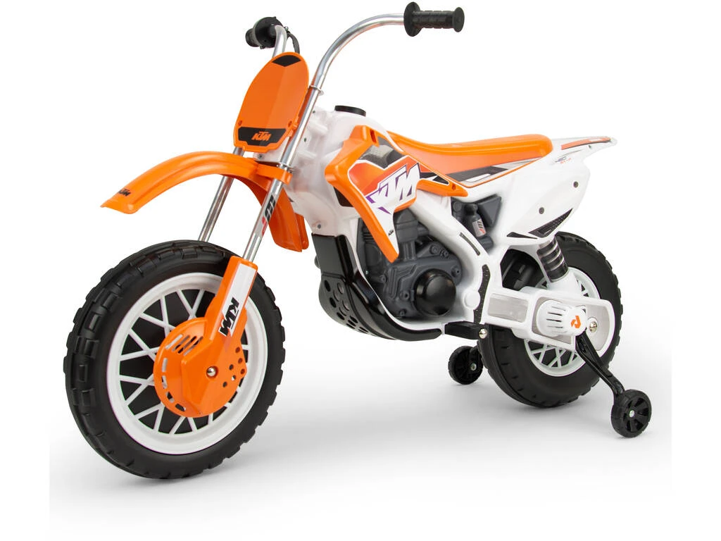 Incluye: 1 moto infantil KTM SX de color naranja y blanca con acelerador en el puño derecho, bandas de goma en las ruedas para mayor agarre, cubremanetas, guardabarros y ruedines estabilizadores, 1 batería de 12v para la moto y 1 cargador para la batería.