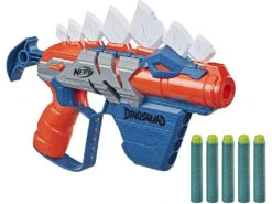 Consigue este práctico y ligero lanzador Nerf inspirado en uno d ellos dinosaurios más populares, el Stegosaurus. Se trata de un lanzador de mediano tamaño, muy fácil y rápido de cargar y lanzar, con portadardos con hueco para 4 unidades y palanca de recarga en la parte trasera.