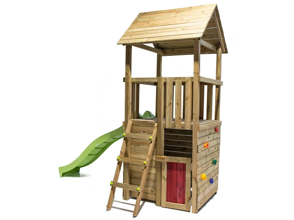 Hazte con esta maravillosa torre que incluye todo lo que los pequen buscan para divertirse. Una torre con pared de escalada, casita con puerta, casita elevada, escalera, tobogán e incluso un genial columpio individual para los más peques. Encuentra el lugar ideal donde instalar este mágico parque infantil de madera, el más estable, completo y genial del momento.
