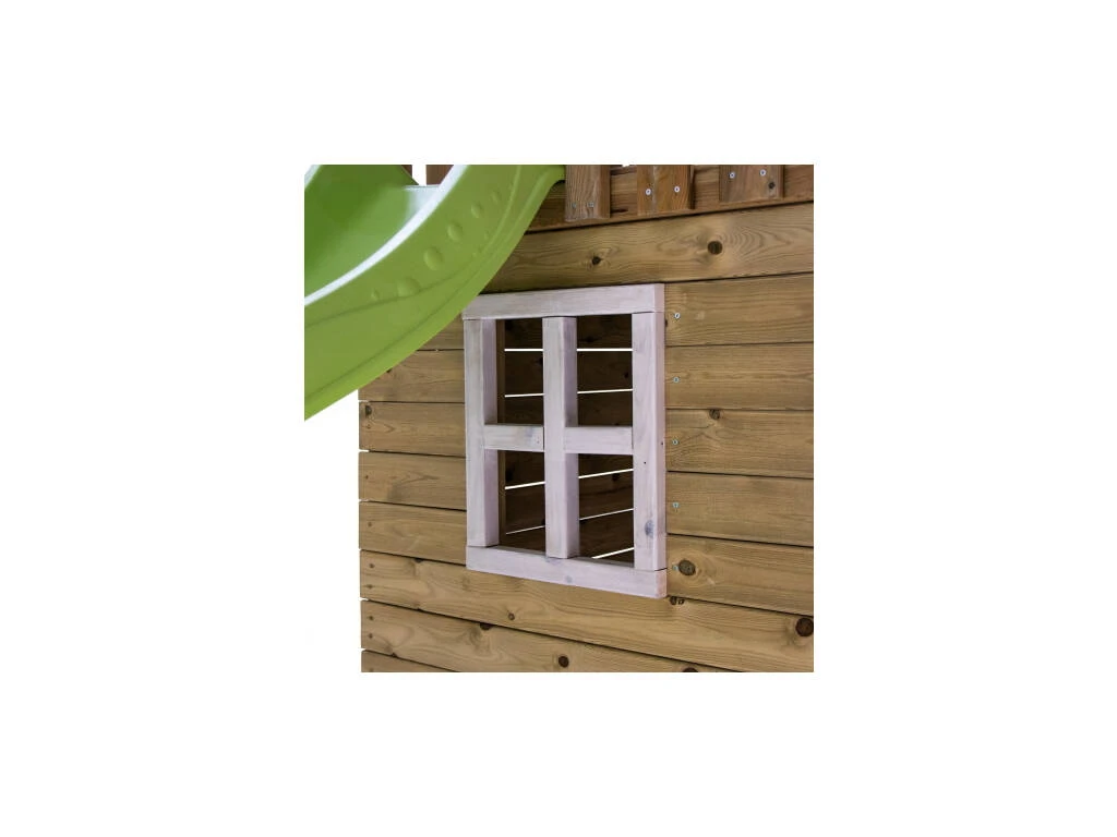 Incluye: 1 parque infantil Canigo con casita con puerta y ventana, casa elevada con techo, escalera de madera, zona de escalada, tobogán, set de anclajes, asiento de plástico liso, córners, enganches y anclajes para el columpio.