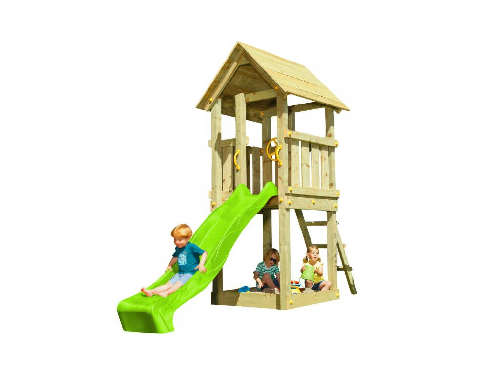 Incluye: 1 parque infantil Kiosk XL con Columpio Individual, casa con techo elevada, escalera, arenero en la base (sin arena), rampa tobogán de plástico, un asiento de plástico liso para el columpio, córners, enganches y anclajes.