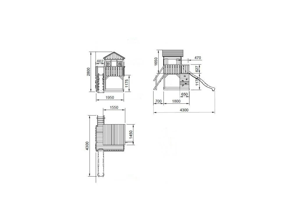 Medidas aproximadas del parque infantil: 276,5 cm de alto, 195 cm de ancho y 432,5 cm de largo.