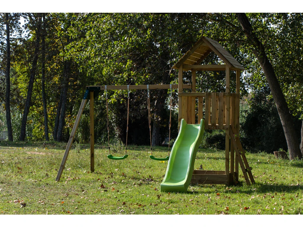 La casita elevada a 120 cm de altura, tiene acceso gracias a una escalera lateral, barandillas de seguridad, techo y un gran tobogán para poder descender y deslizarse de manera divertida. Pero eso no es todo, ya que en el lateral de la torre, encontramos un columpio doble con dos asientos individuales de material resistente, cuerdas sintéticas y capaz de soportar hasta 50 kilos cada uno de ellos.