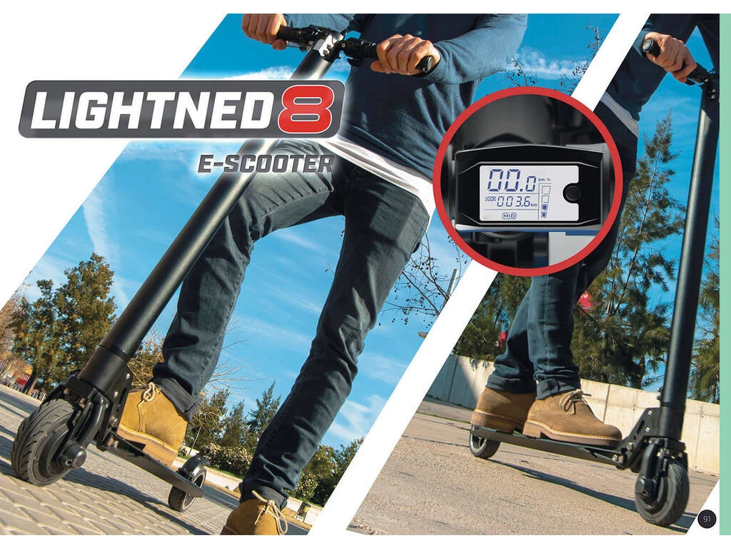 El Patinete E-Scooter Lightned 8a, puede soportar un peso de hasta 100 kilos, tiene un motor Brushless y dispone de una batería de 24 V 8.800 mAh 211 W, con una velocidad regulable de hasta 23 km/H y una autonomía de hasta 20km, dependiendo del peso del conductor, la inclinación del terreno o el estado del pavimento.