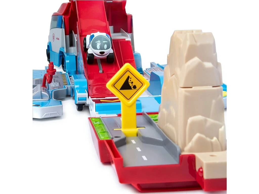 Incluye: 1 camión de la Patrulla Canina convertible en escenario de juego con rampa, taller y montaña con sorpresa y 1 vehículo de metal Robo Dog.