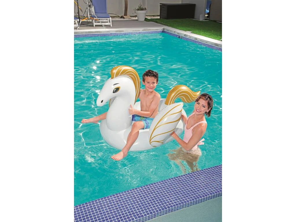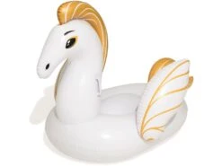Consigue este magnífico hinchable con forma de Pegaso blanco y dorado, un genial hinchable con doble cámara de aire, asas súper resistentes y un diseño a todo color sobre el vinilo muy resistente y de alta durabilidad. ¡Justo lo que buscas para pasarlo en grande junto a los más peques y una forma segura!