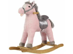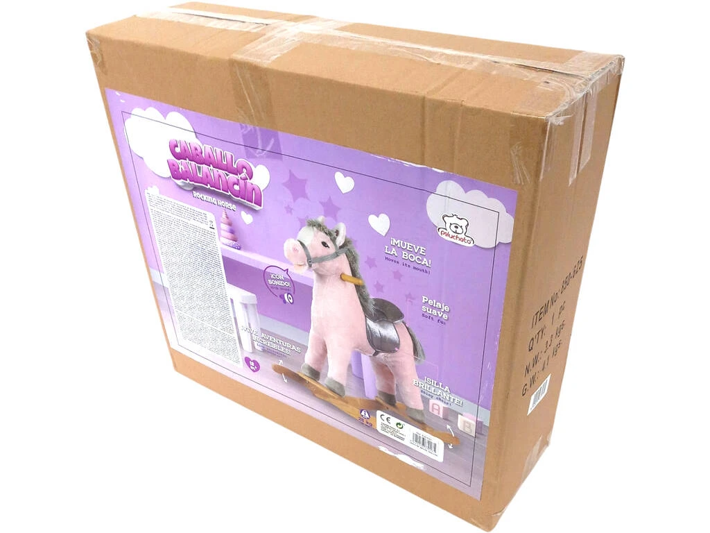 Incluye: 1 peluche balancín caballo de color rosa y gris con base de madera, pelaje suave, silla brillante, sonidos y movimiento de boca.