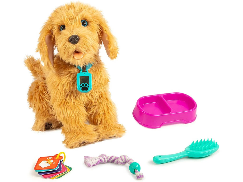Incluye: 1 perrito peluche interactivo Moji de color marrón con collar inteligente de color azul, 1 comedero rosa, 1 juguete para perritos, 1 cepillo para el pelo, tarjetas de cuidado e instrucciones (castellano, inglés, italinao y portugués).