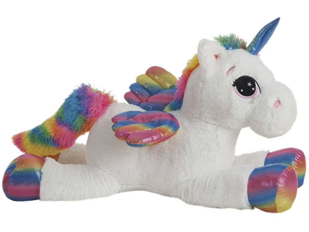Incluye: 1 unicornio de peluche Rainbow con cuerpo suave y blandito, patitas, alas y cresta multicolor, cuerno dorado y ojos bordados.