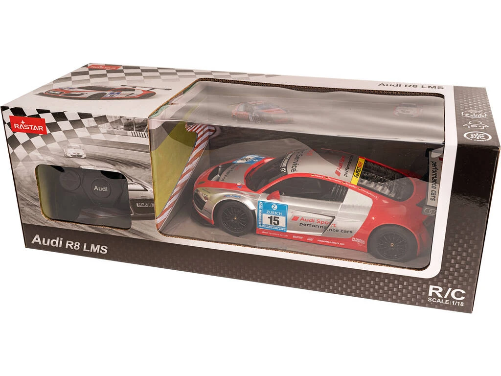 Incluye: 1 vehículo RC Audi R8 LMS de color plateado y 1 control remoto para el vehículo.