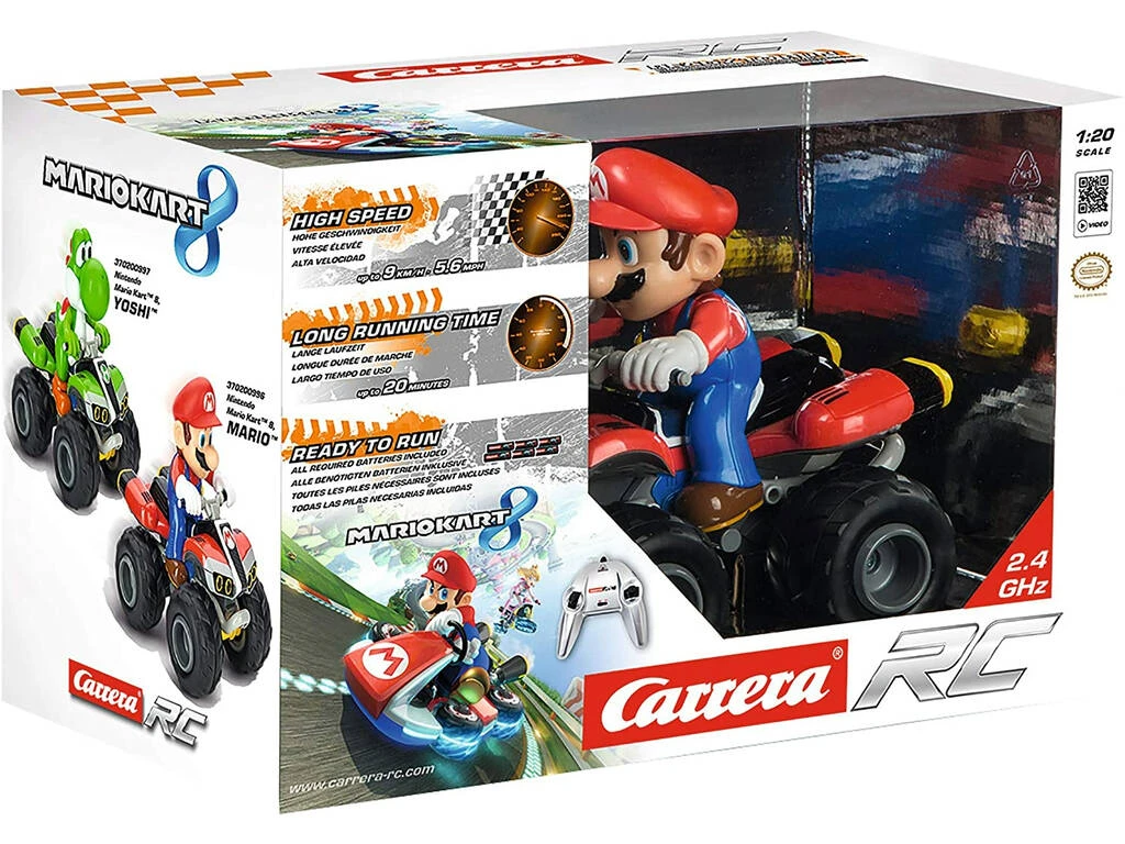 Toma el control de este divertido vehículo RC junto a Mario, disfruta de un nuevo quad sobre el que Mario ha de triunfar y hacerse con la copa de campeón. Toma el control de juguete con el control remoto, capaz de hacer al juguete avanzar, parar, retroceder y girar a ambos lados. El vehículo incluye tecnología 2,4 GHz para evitar incómodas interferencias al disfrutarlo junto a otros vehículos RC.