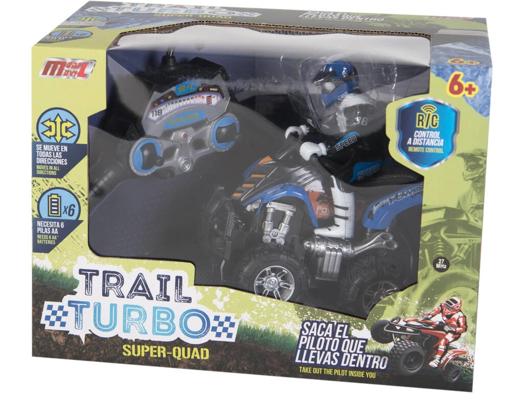 Incluye: 1 vehículo radiocontrol Quad Cross Country de color azul con piloto y 1 control remoto para el vehículo.