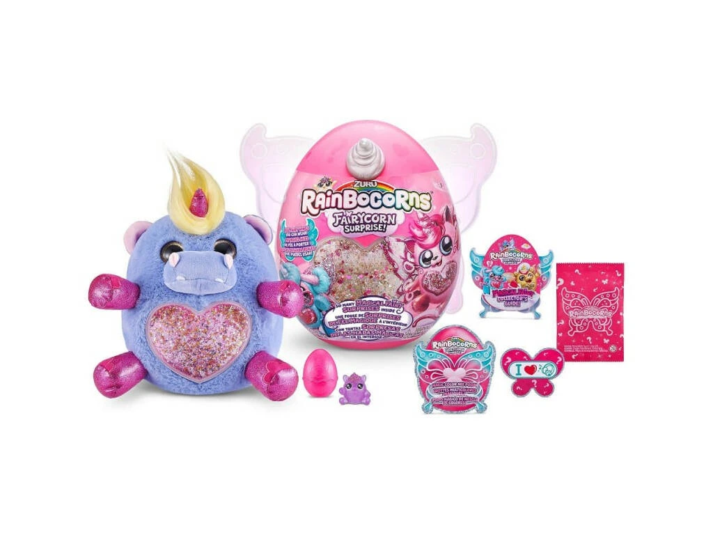 Incluye: 1 huevo gigante con peluche sorpresa FairyCorn con corazón de gelatina, 1 par de alas de hada, 2 huevos, 1 Boo-Boocorn, 1 paquete de popó de RainboCorn (3g.), 1 pista para empollar y 1 guía para colecionistas.