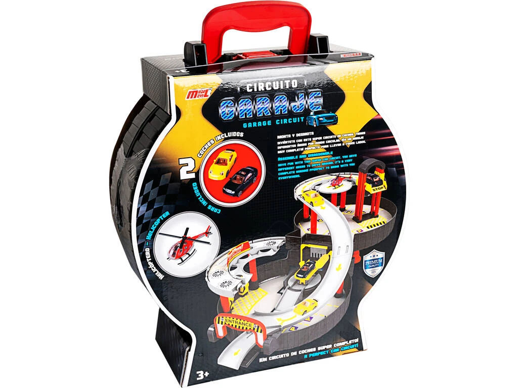 Incluye: 1 maletín rueda circuito garaje con asa de transporte, rampas y helipuerto, 1 helicóptero y 2 coches.