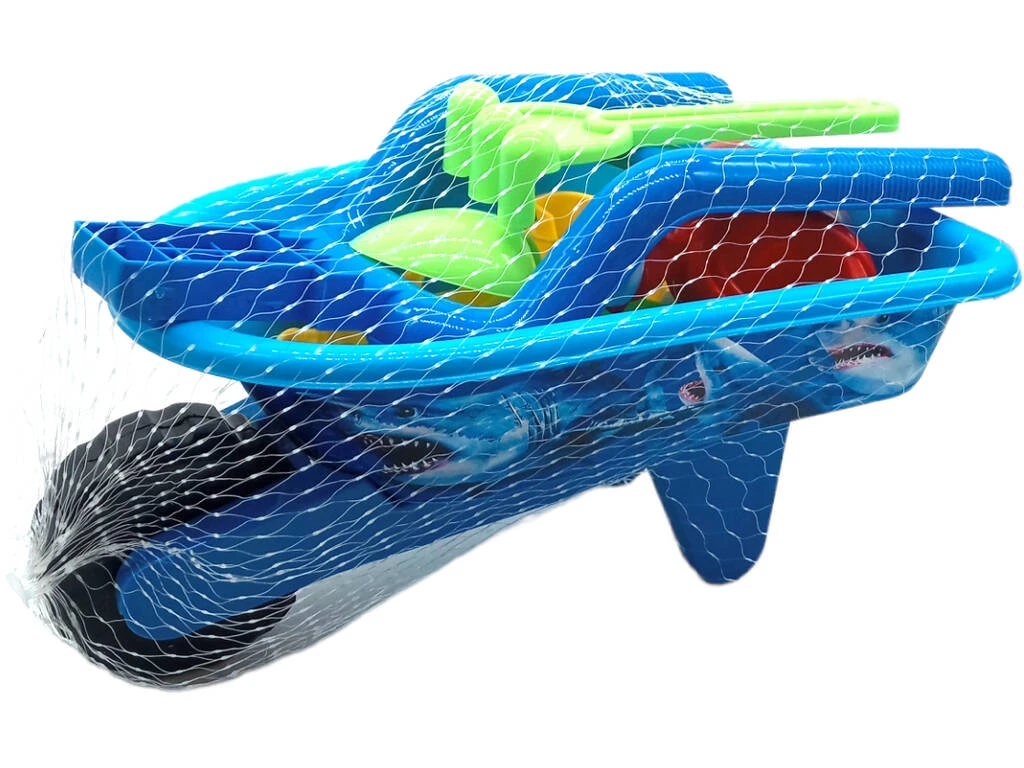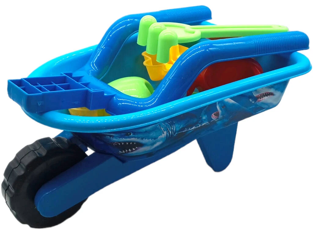 Cuenta con una carretilla azul de estructura ligera de animales marinos, una regadera rojiza, herramientas para que puedan mover la arena con facilidad y moldes diferentes. ¡Hora de la creación!