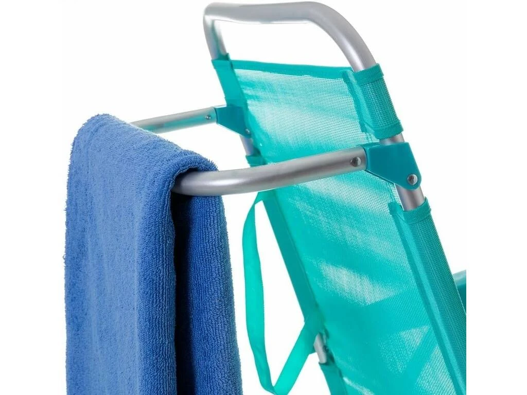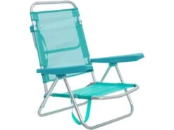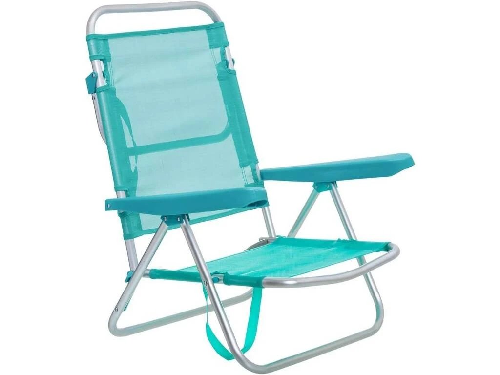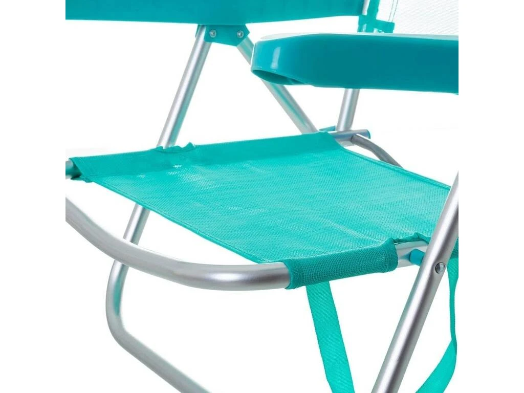 Incluye: 1 silla de playa baja con estructura plegable de aluminio, varias posiciones de uso, tela muy resistente de color agua marina, apoyabrazos de plástico color aguamarina y asas de transporte.