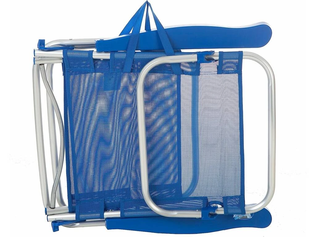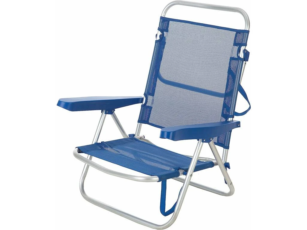 Incluye: 1 silla de playa baja con estructura plegable de aluminio, varias posiciones de uso, tela muy resistente de color azul oscuro, apoyabrazos de plástico color azul oscuro y asas de transporte.