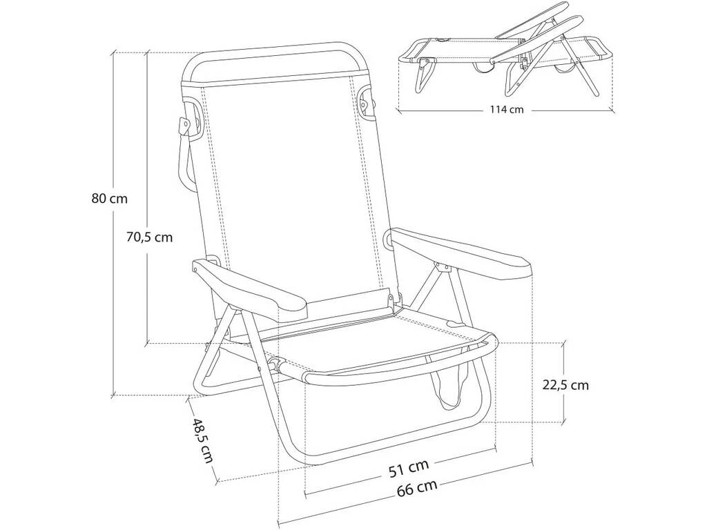 Medidas aproximadas de la silla desplegada: 80 cm de alto, 66 cm de ancho y 48,5 cm de largo.