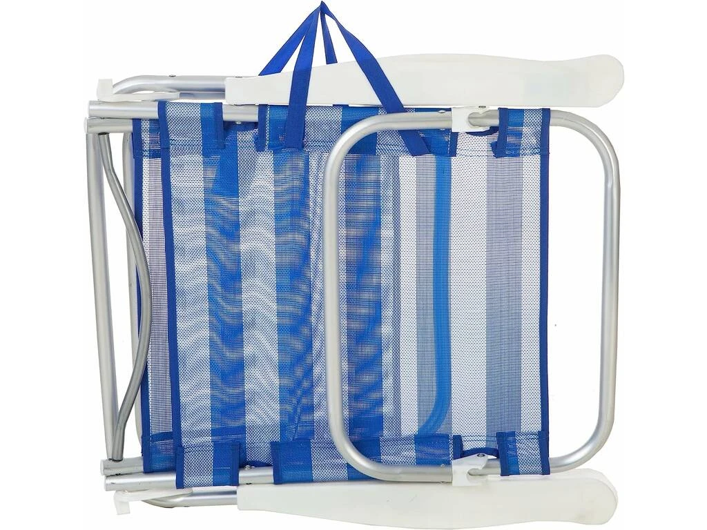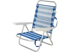 Incluye: 1 silla de playa baja con estructura plegable de aluminio, varias posiciones de uso, tela muy resistente de color azul y blanca a rayas, apoyabrazos de plástico color blanco y asas de transporte.